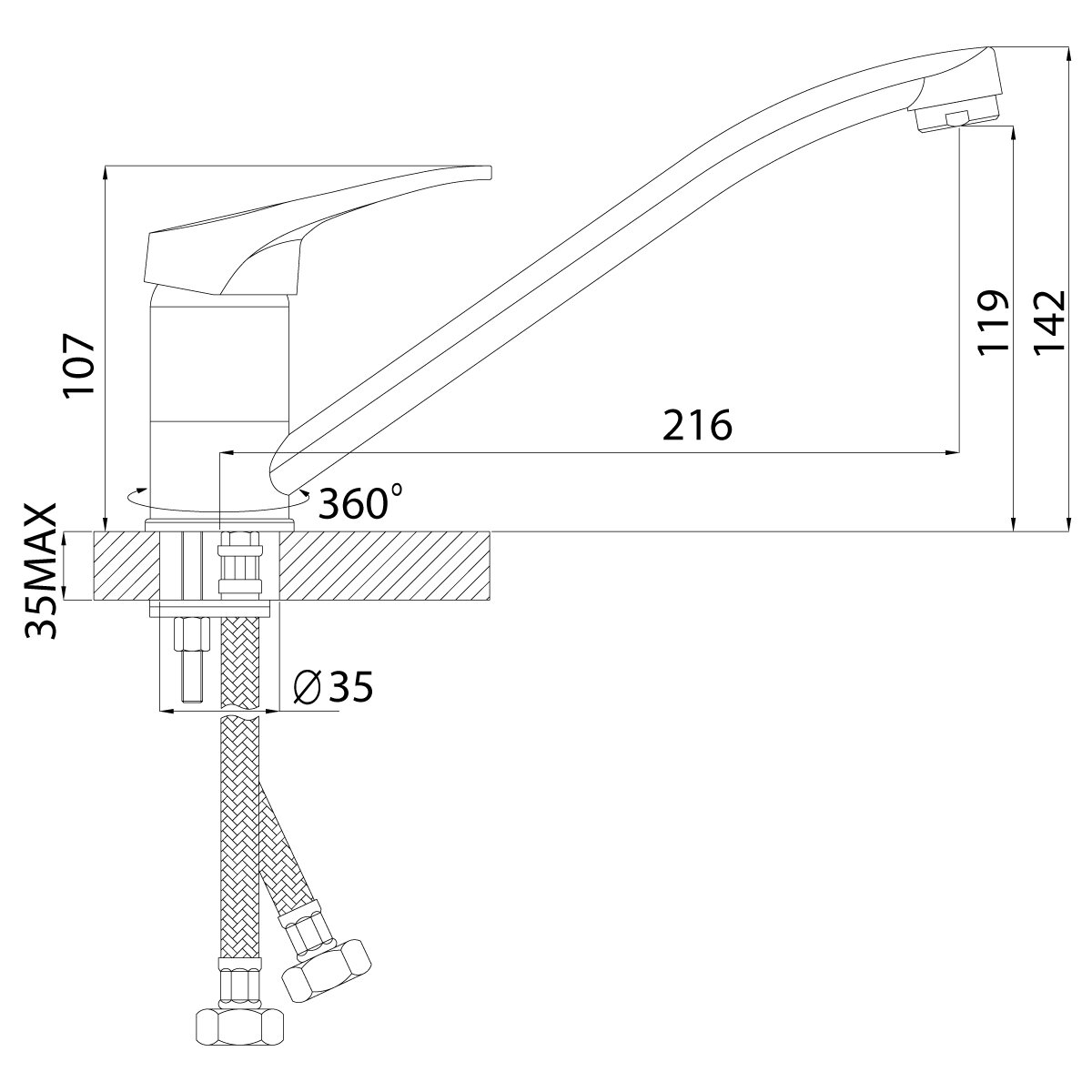 ROSSINKA B35-21U, Смеситель одноручный (35 мм) для кухни с поворотным изливом 250 мм, крепление универсальное, хром
