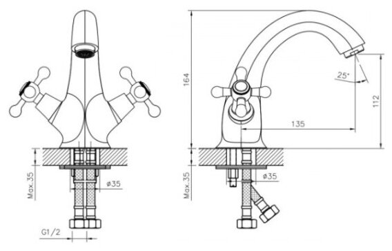| Комплектация | Пластиковый аэратор ;Керамические вентильные головки (угол поворота – 90 градусов) ;Гибкая подводка 35 см – 2 шт ;Присоединительная группа для горизонтального крепления ;Пластиковые рукоятки |