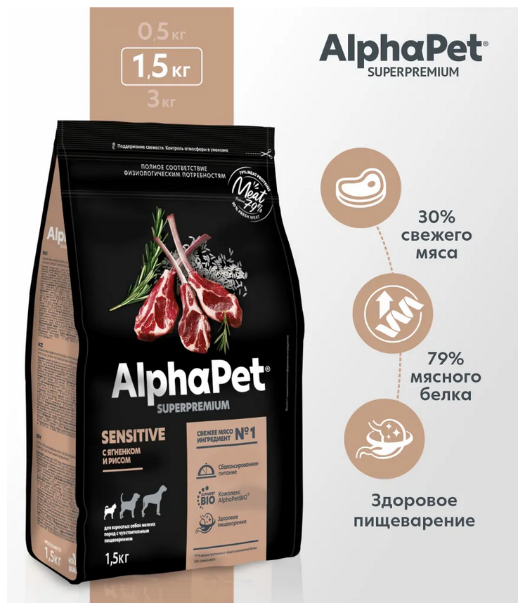 AlphaPet Сухой полнорационный корм Superpremium с ягненком и рисом, для взрослых собак мелких пород с чувствительным пищеварением, 1,5 кг