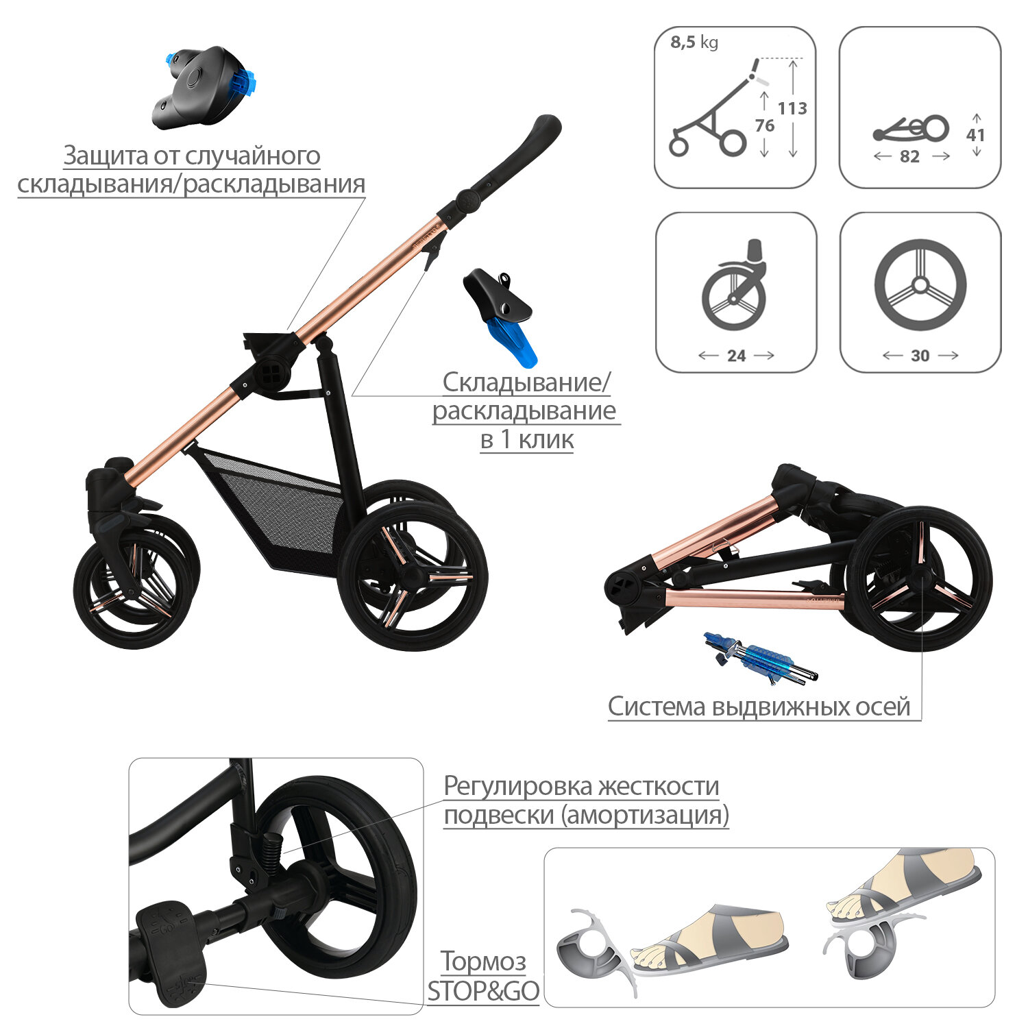 | Особенности шасси | корзина для покупок / перестановка блока лицом/спиной / регулировка высоты ручки / съемные колеса |