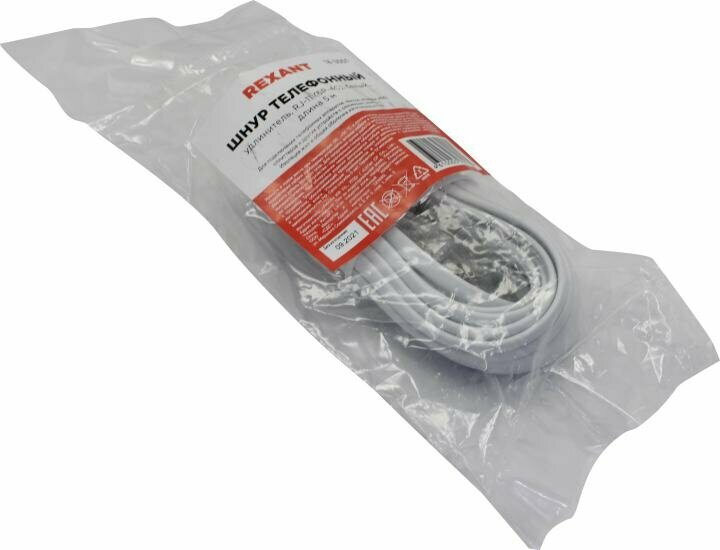 Телефонный удлинитель (патч-корд, соединительный шнур), 6Р4С, RJ-11, 5 метров, Rexant 18-3051