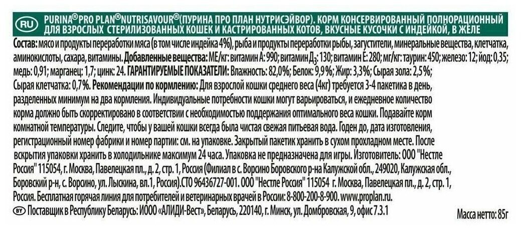 СохранитьВлажный корм Pro Plan Nutri Savour для взрослых стерилизованных кошек и кастрированных котов, вкусные кусочки с индейкой, в желе, Пауч, 85 гр., 26 шт. интересное: