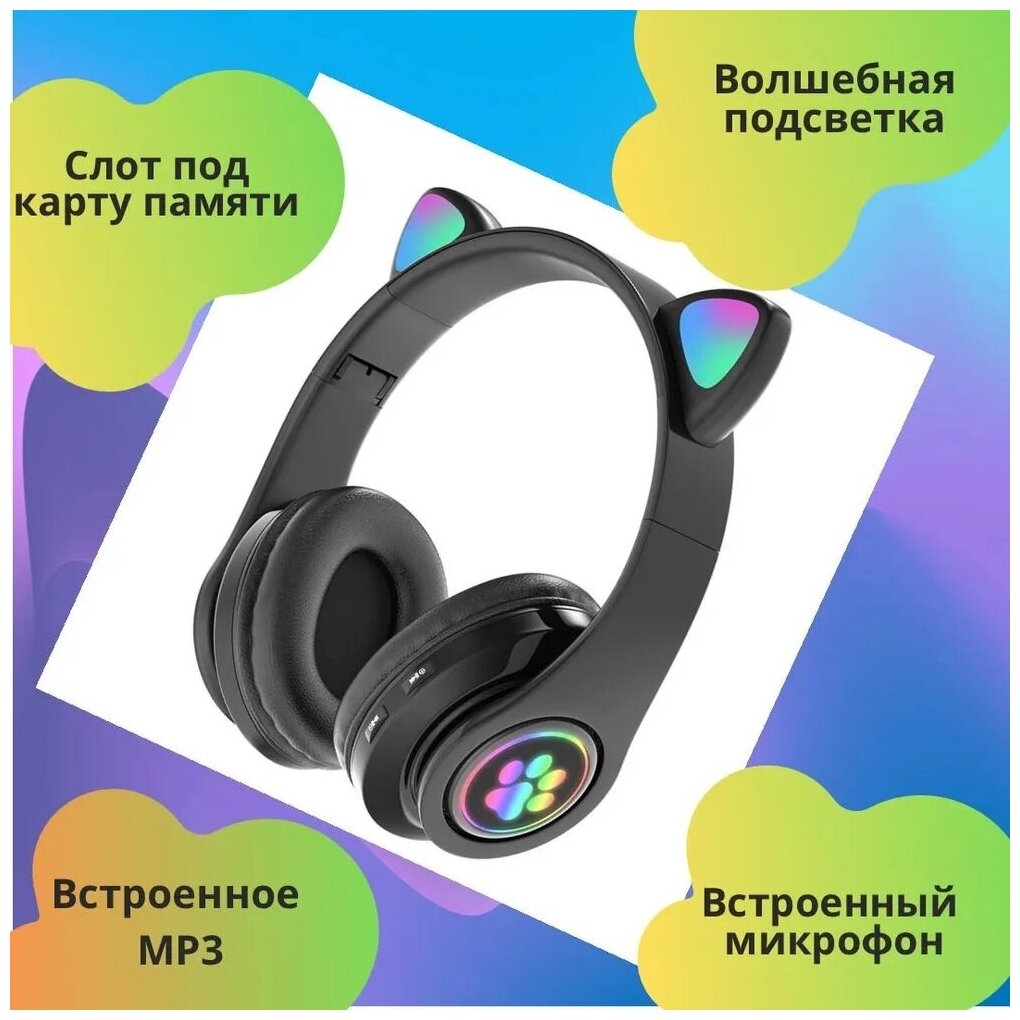 Беспроводные Bluetooth наушники с подсветкой "Кошачьи ушки" / Наушники с подсветкой / Детские наушники / Черный