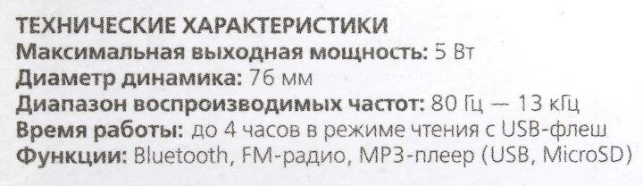| Плюсы: | Аккумулятор с зарядкой usb! Хороший фонарик. Радио работает, МП3 с карты и с флешки читает. Звук вполне приличный. |