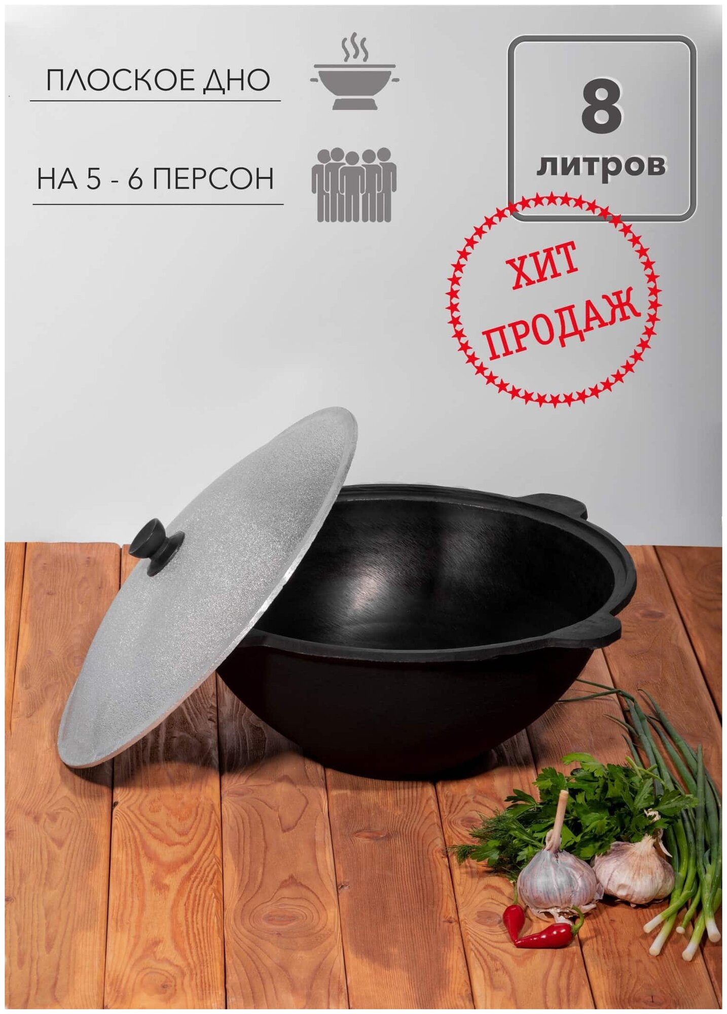 Узбекский чугунный казан (плоское дно) 8 л с крышкой Наманган