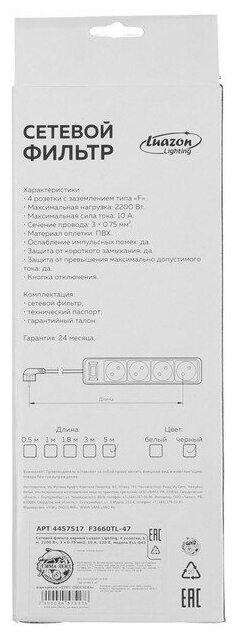 СохранитьLuazon Lighting Сетевой фильтр Luazon Lighting, 4 розетки, 5 м, 2200 Вт, 3 х 0.75 мм2, 10 А, 220 В, черный интересное: