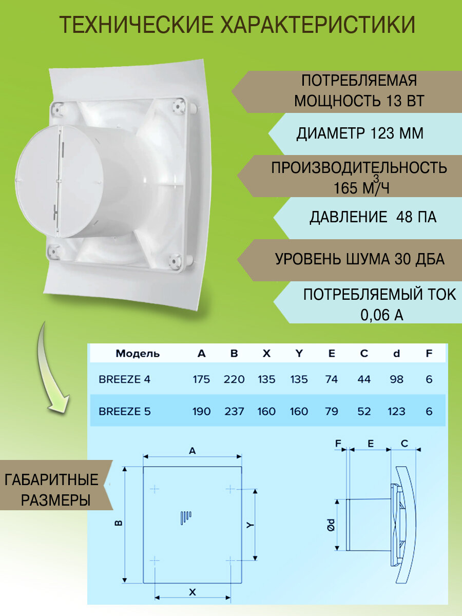 BREEZE 5C MRH вентилятор вытяжной малошумный с таймером и датчиком влажности, c обратным клапаном на шарикоподшипниках D123