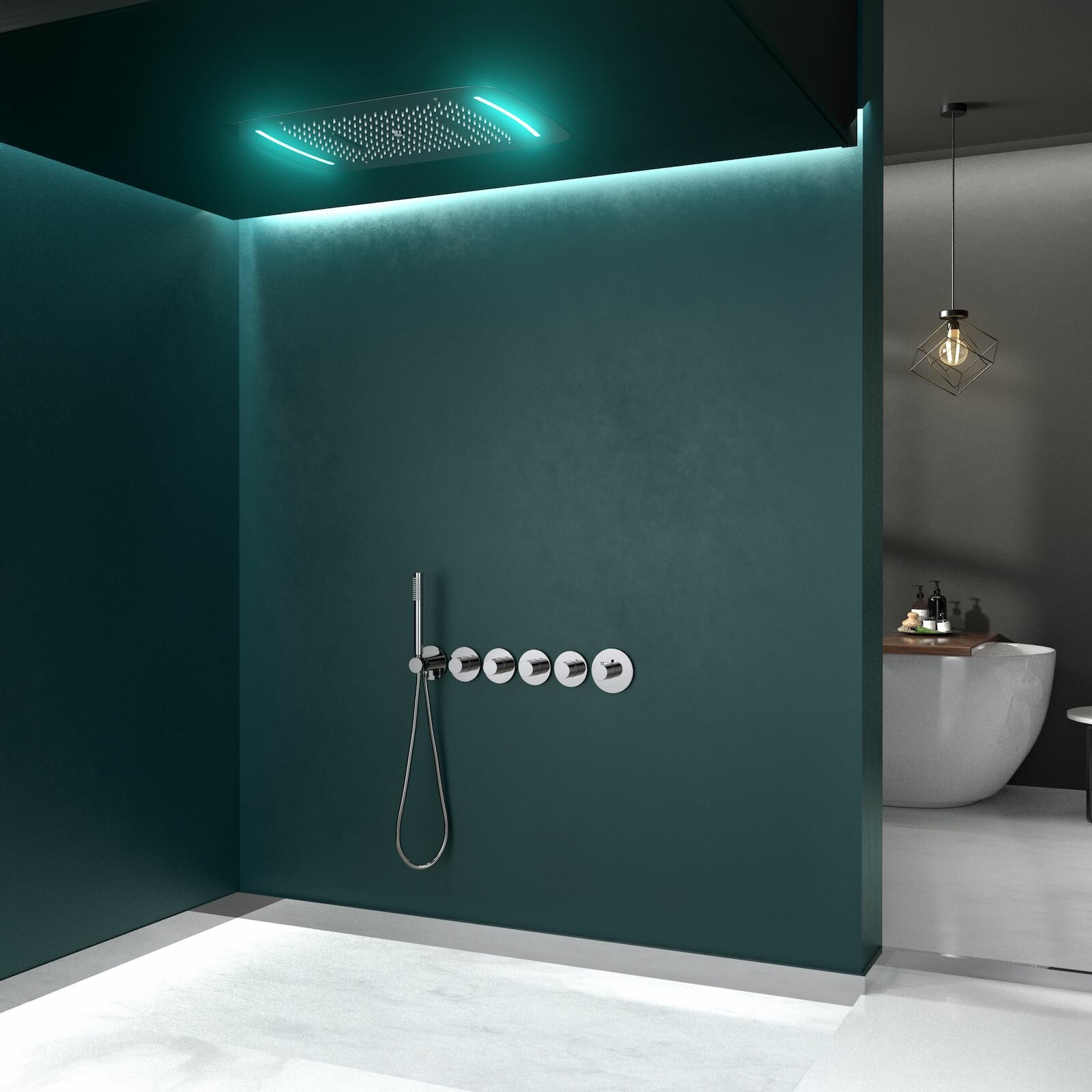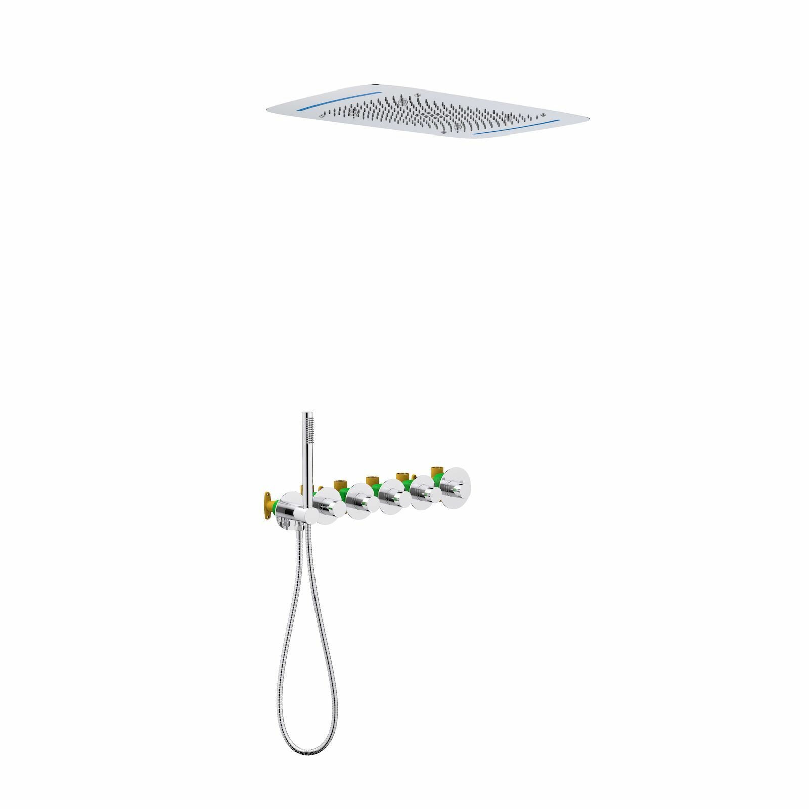 | Дополнительная информация | Встраиваемый блок управления душевой системой (латунный) - 1 шт. Корпус потолочного душа (латунный) - 1 шт. Душевая панель (латунная) 680*430 мм - 1 шт. Винты с гайками для крепления подвесных кронштейнов (комплект) - 4 шт. Держатель ручной лейки с подключением душа (латунный) - 1 шт. Подвесные кронштейны - 2 шт. Подводка к тропическому душу - 3 шт. Ручка дивертора - 4 шт. Ручка управления термостатом - 1 шт. Декоративные накладки с гильзами (комплект) - 6 шт. Ручная лейка (латунная) - 1 шт. Соединительная трубка для подключения ручного душа - 1 шт. Шланг душа 1,5 м - 1 шт. Блок управления подсветкой - 1 шт. Инвертор (преобразователь тока) - 1 шт. Т-образный соединитель проводов - 1 шт. Скрытый провод - 1 шт. Провод блока управления подсветкой - 1 шт. Инструкция - 1 шт. |