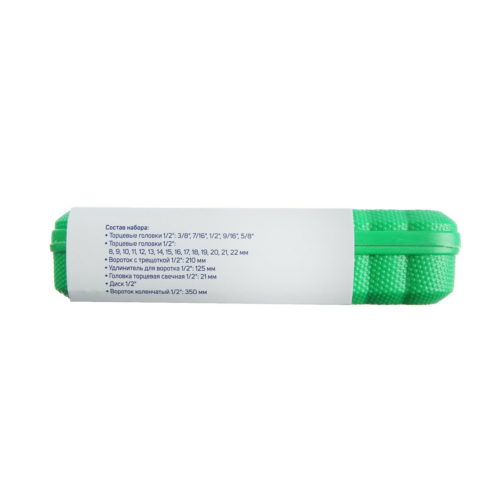 | Головки торцевые подробно | 8, 9, 10, 11, 12, 13, 14, 15, 16, 17, 18, 19, 21, 22 мм, свечная 21 мм, дюймовая: 3/8", 7/16", 1/2", 9/16", 5/8"; вороток коленчатый 350 мм |