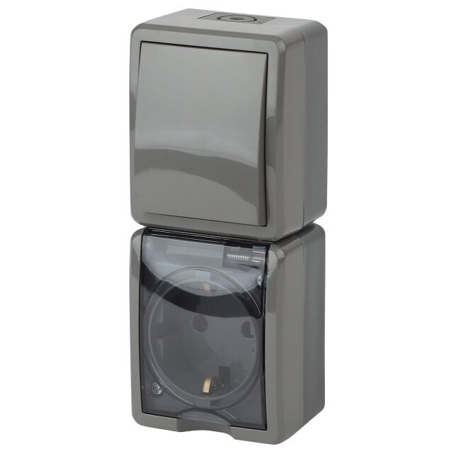 | Дополнительная информация | Блок 1-клавишный выключатель и розетка ЭРА Эксперт IP54 вертикальный с/з серый |