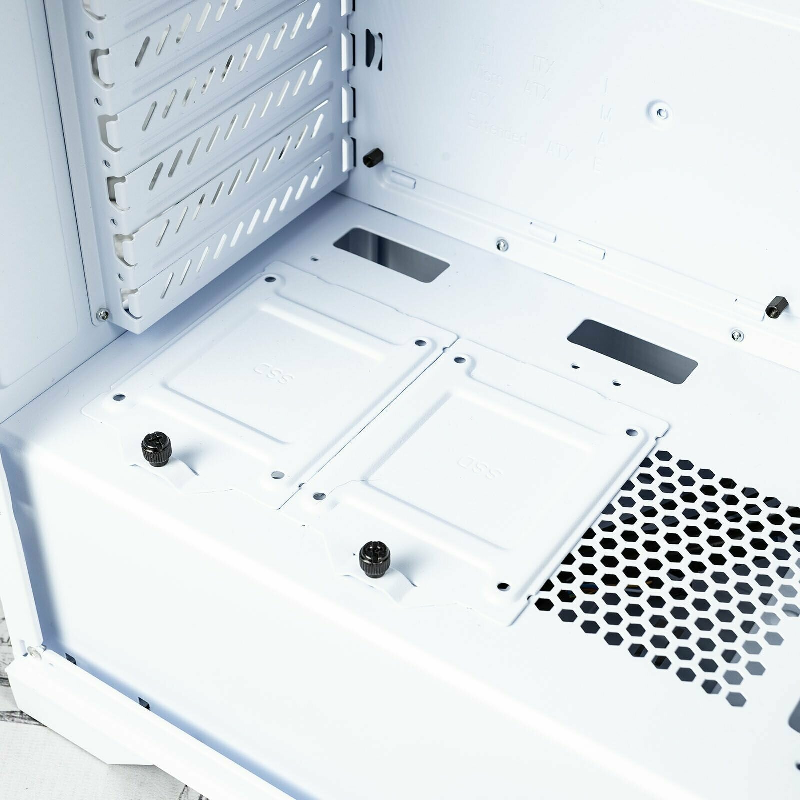 - Болтики для безотверточной фиксации стекла и правой стенки выглядят дешего и не особо надежно. - Лицевая панель выглядит простенько (на любителя), есть перфорация (по бокам) для забора фронтальных вент-ров. |