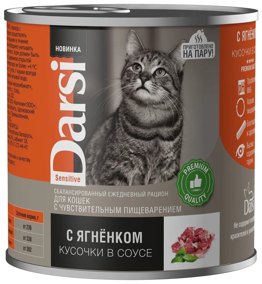 Консервы Darsi для кошек с чувствительным пищеварением "Кусочки с Ягненком в соусе", 250гр, 2шт
