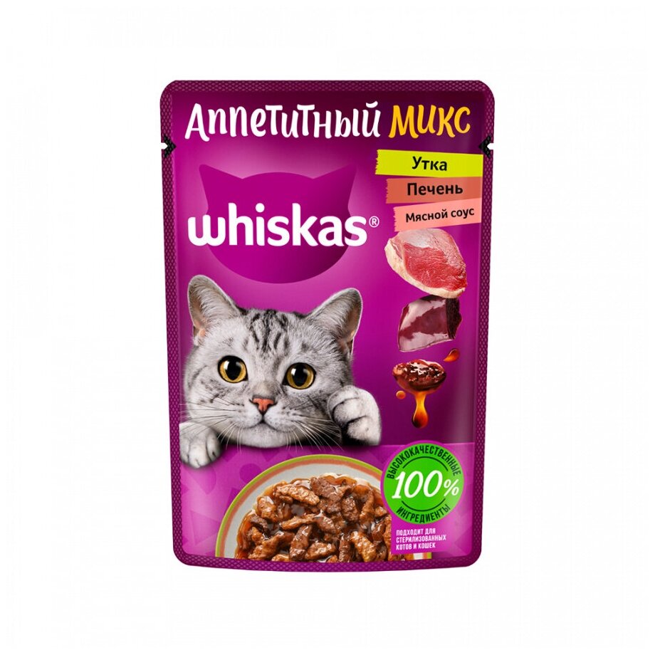 Whiskas Аппетитный микс влажный корм для взрослых кошек, с уткой и печенью в мясном соусе, в паучах - 75 г х 28 шт