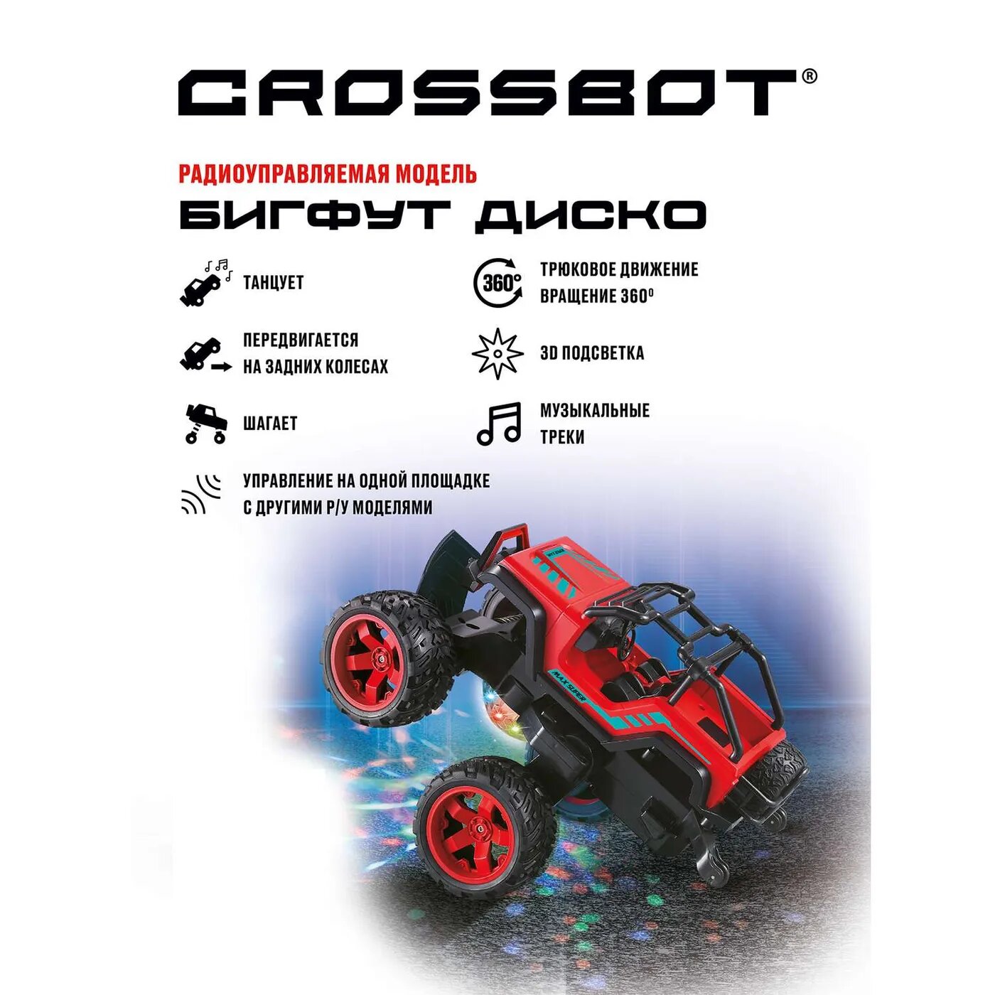 Машинка на радиоуправлении Crossbot Бигфут Диско танцует, 3D подсветка, красный