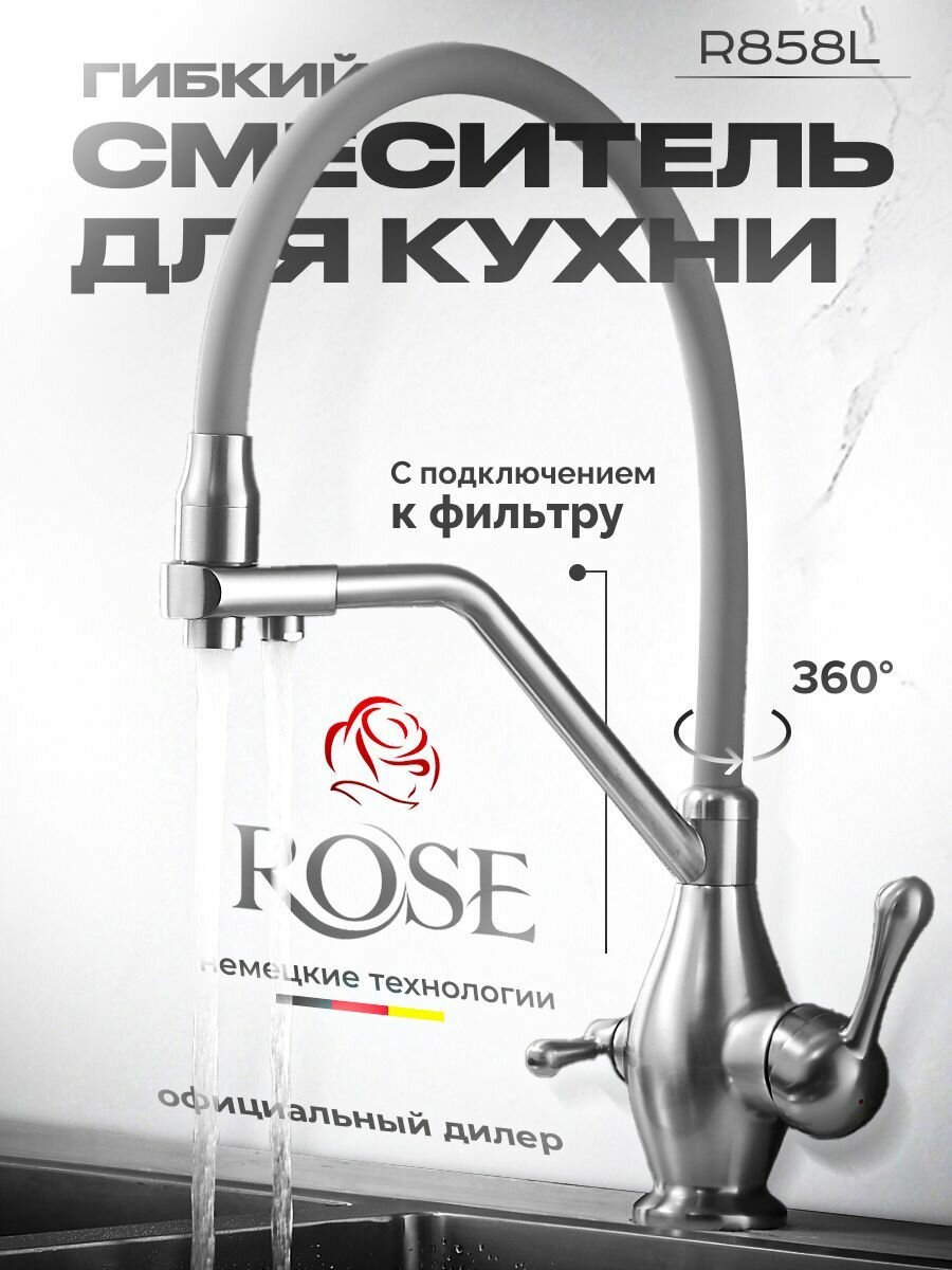 Смеситель для кухни с гибким изливом и подключением фильтра Rose R858L интересное: