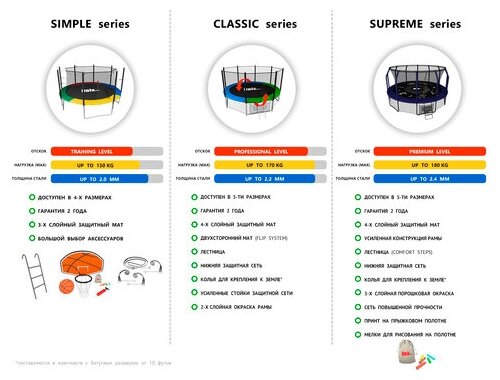 | Состав набора | Батут, Защитный мат, Защитная сеть, Инструкция на русском языке |