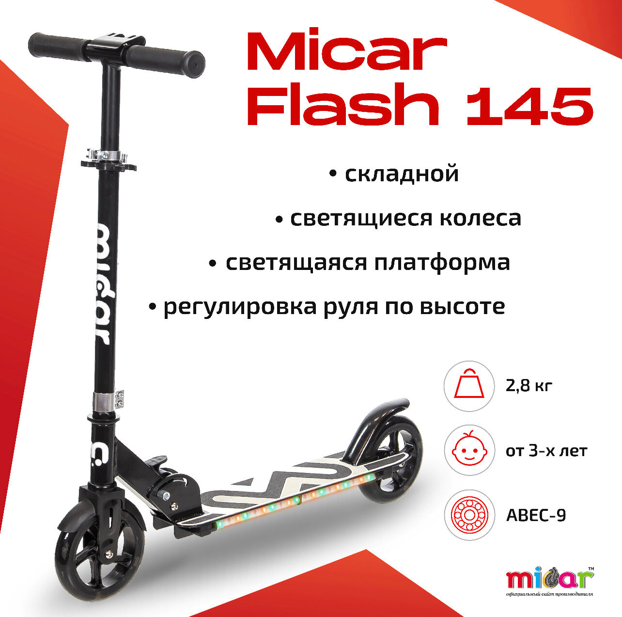 Ниже Вы можете прочитать отзывы на Складной двухколёсный самокат со светящимися колёсами и платформой Micar Flash 145 Черный, ознакомится с подробными характеристиками, посмотреть интересные обзоры и фотографии на Складной двухколёсный самокат со светящимися колёсами и платформой Micar Flash 145 Черный.
