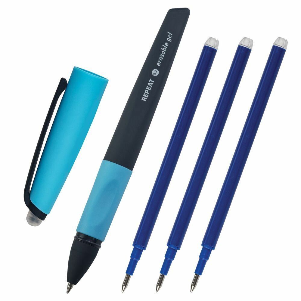Купить Ручка стираемая гелевая с эргономичным грипом BRAUBERG REPEAT, синяя, +3 сменных стержня, узел 0,7 мм, линия письма 0,5 мм, 143663