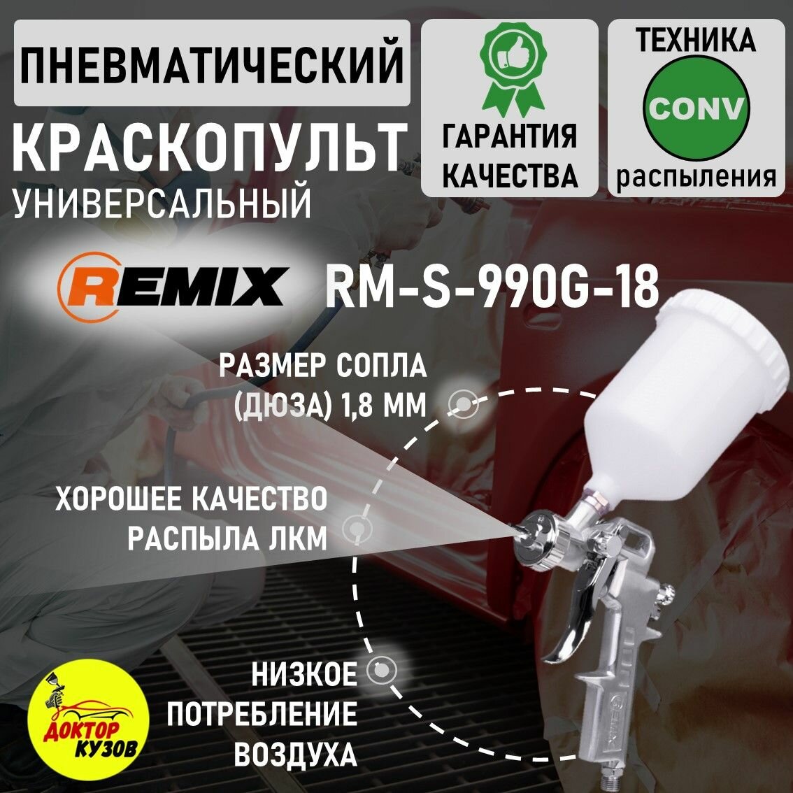 Краскопульт пневматический окрасочный универсальный REMIX S-990G дюза 1,8 ММ, верхний бачок 600 МЛ, RM-S-990G-18