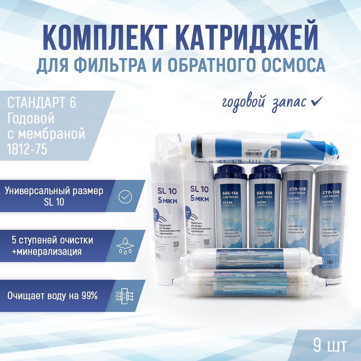 Сменные фильтры, комплект картриджей "Стандарт 6 годовой" с мембраной 1812-75, подходит к Гейзер Барьер Аквафор NatureWater AquaPro Raifil Atoll интересное: