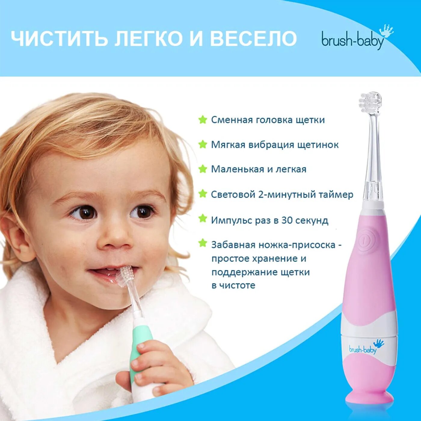 | Плюсы: | Подсветка удобная, сработало на интерес малыша, чистит хорошо. |