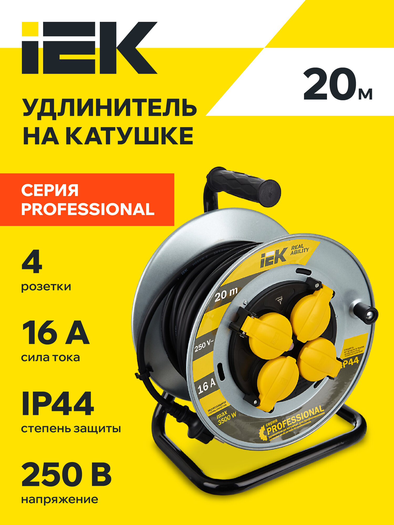 Удлинитель на мет. катушке 4х20м с заземл. 16А IP44 УК20 "Professional" с термозащ. КГ 3х1.5 IEK WKP16-16-04-20-44 (1 шт.)