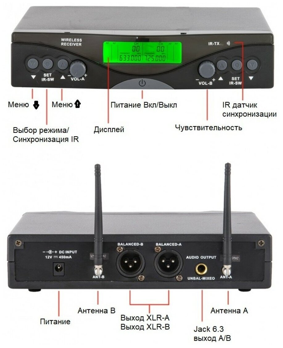 | Подробная комплектация | 2 ручных микрофона с передатчиком, приёмник (база), адаптер питания, шнур для подключения радиосистемы (Jack-Jack), противоскатные резиновые кольца. |