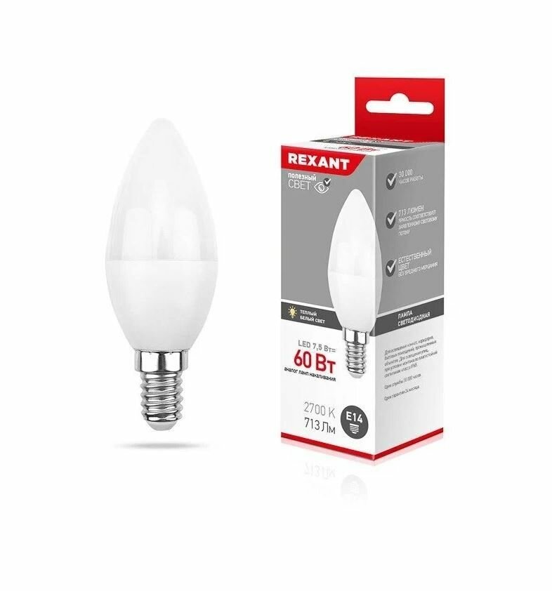 Лампа светодиодная Rexant Свеча, Е14, 7,5 Вт, 2700 К, теплый свет
