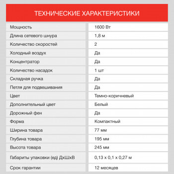 | Плюсы: | 1600 Вт. Концентратор. Сушка холодным воздухом. Защита от перегрева. |