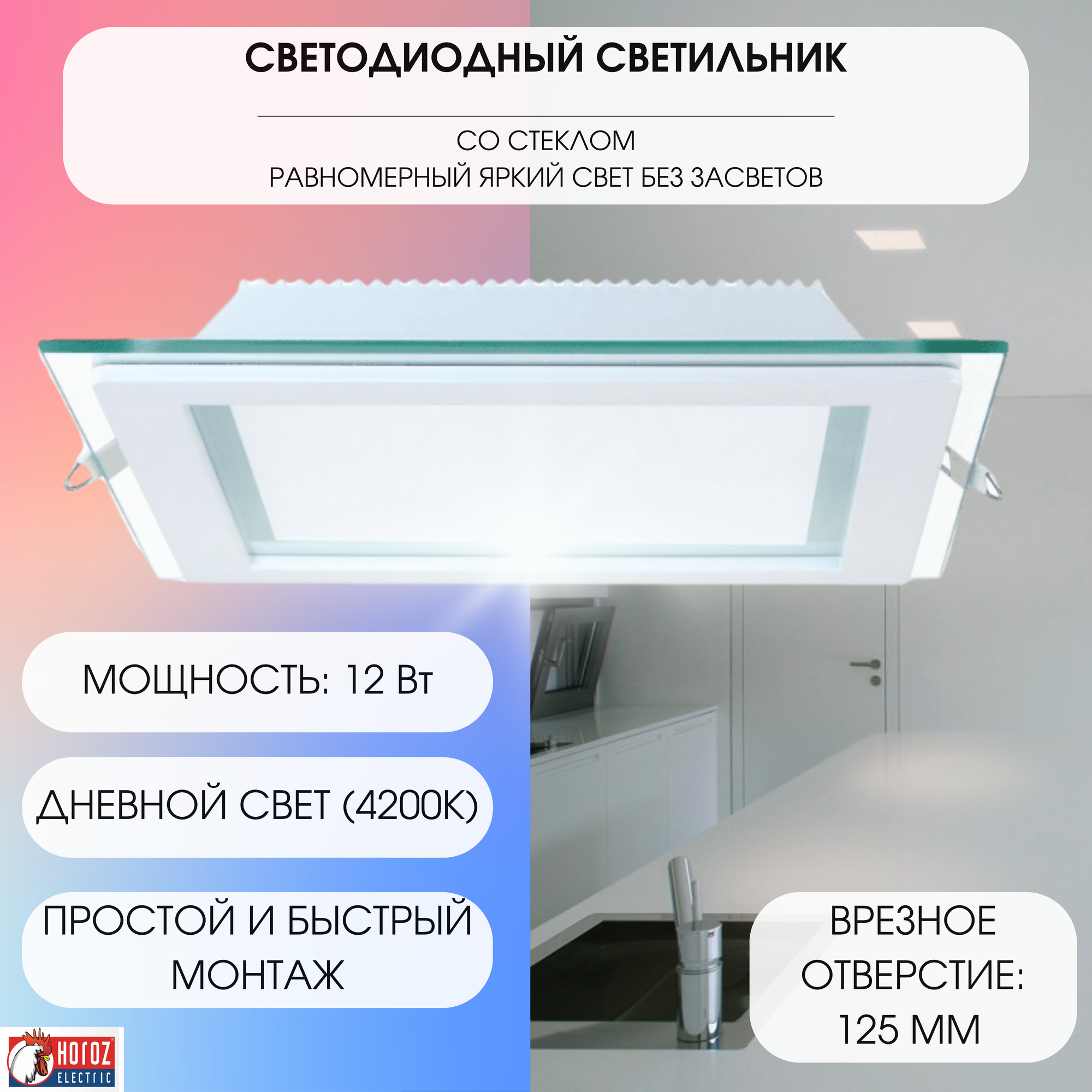 Светильник LED 12Вт 4200К белый встраив. стекло Квадрат HL685LG Horoz 016-015-0012