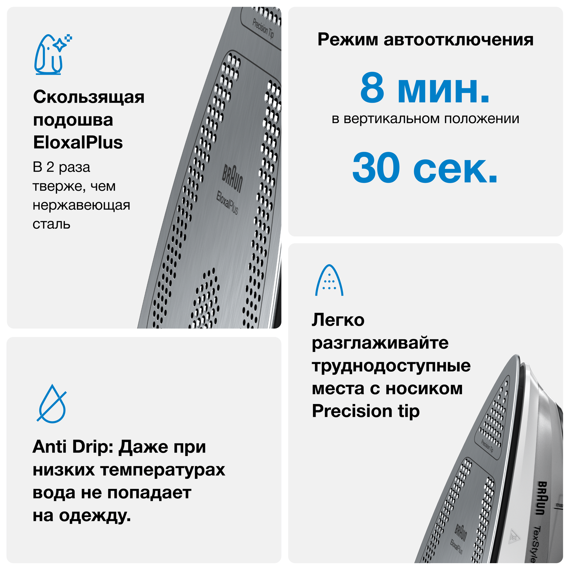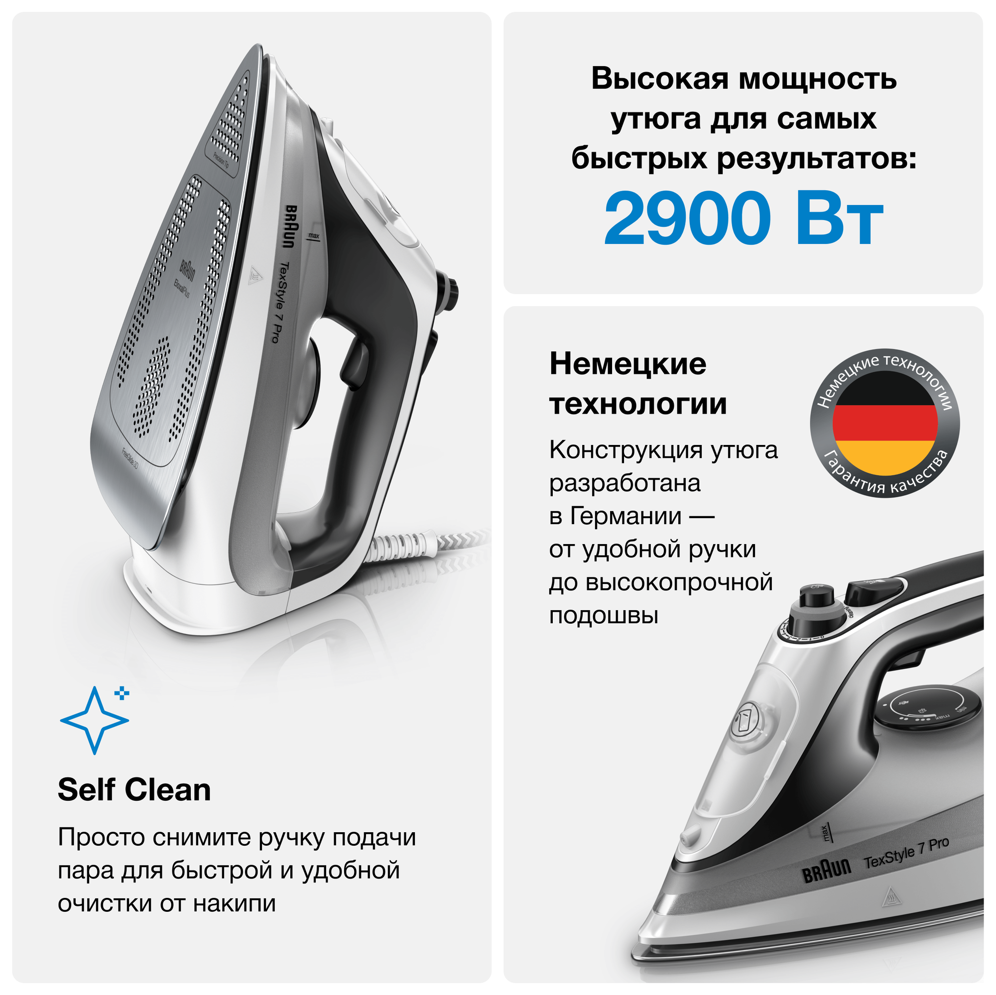 Паровой утюг Braun TexStyle 7 Pro SI7149WB, мощность 2900 Вт, подошва EloxalPlus, паровой удар 220г/мин, автоотключение