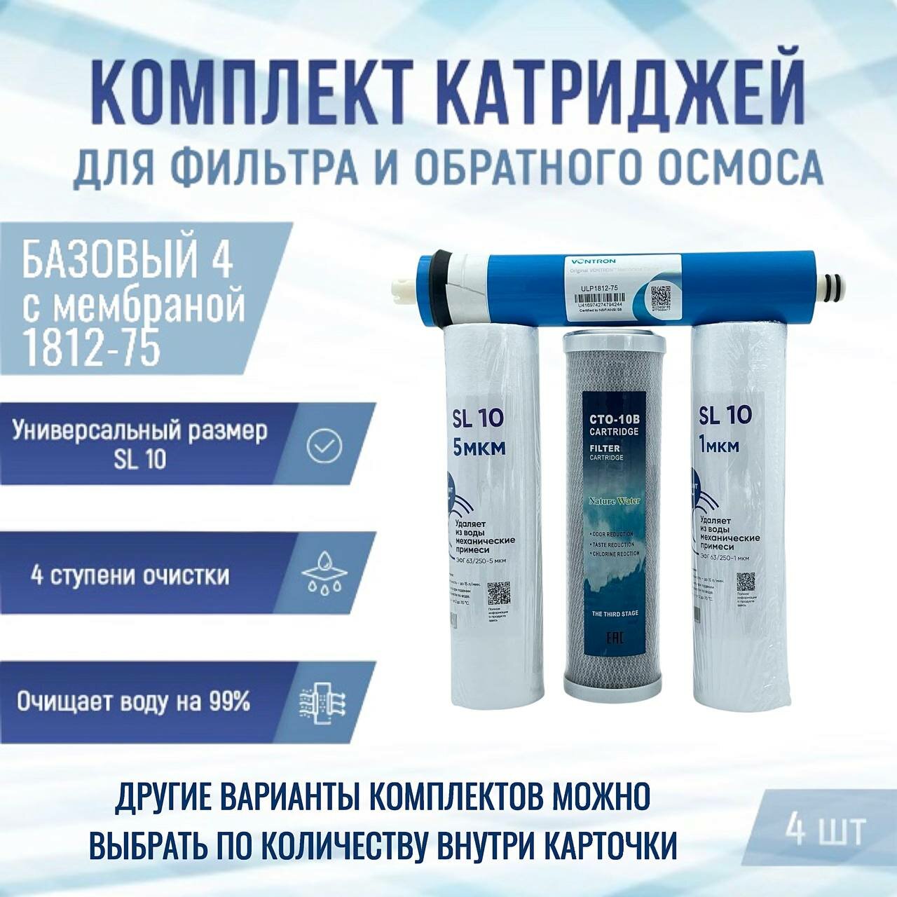 Сменные фильтры, комплект картриджей"Базовый 4" с мембраной 1812-75, подходит к Гейзер Барьер Аквафор NatureWater AquaPro Raifil Atoll Unicorn интересное: