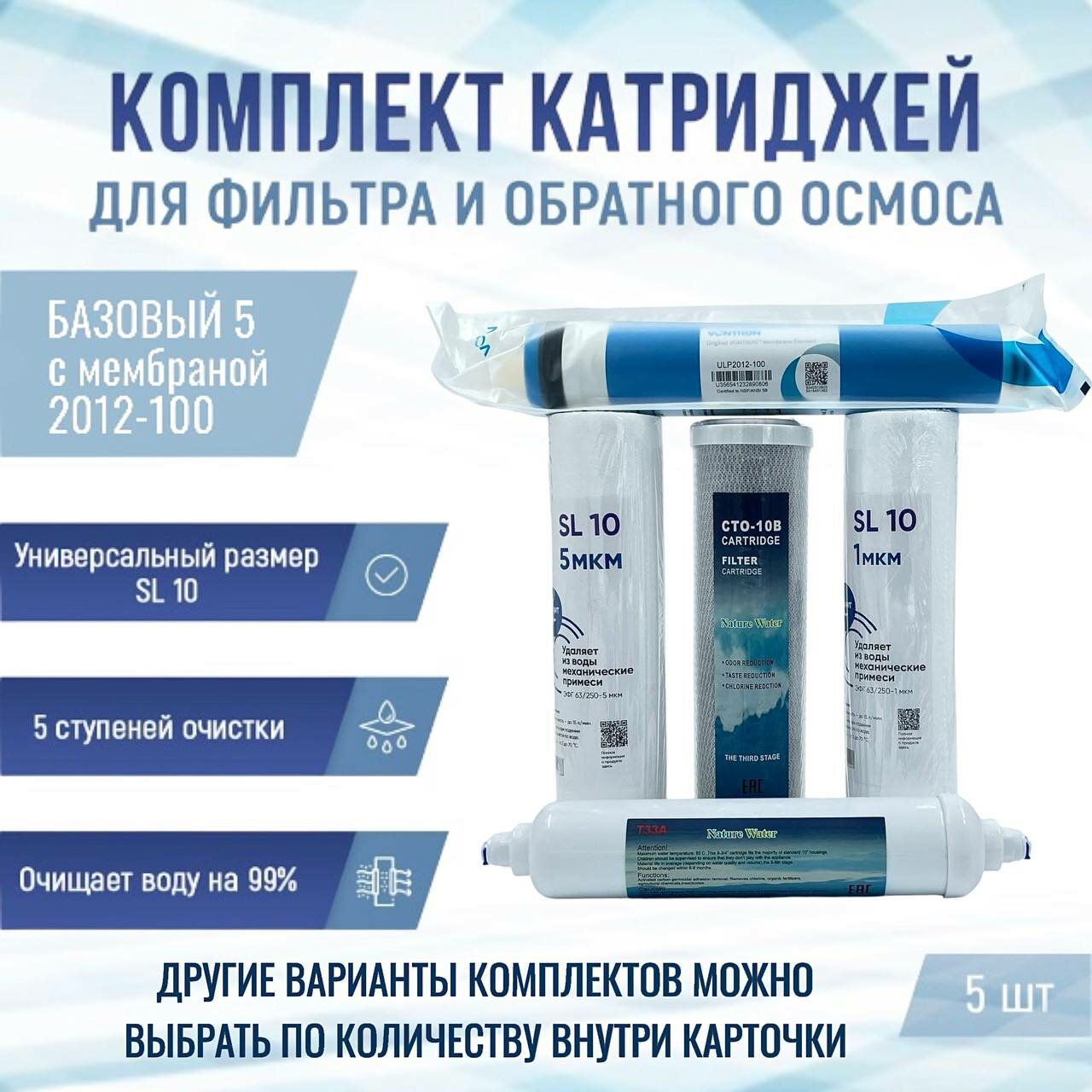 Сменные фильтры, комплект картриджей "Базовый 5" с мембраной 2012-100, подходит к Гейзер Барьер Аквафор NatureWater AquaPro Raifil Atoll Unicorn интересное: