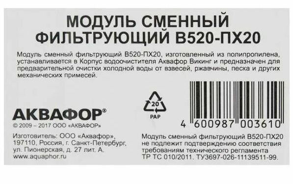 Модуль сменный Аквафор фильтрующий В520-ПХ20 101756 интересное:
