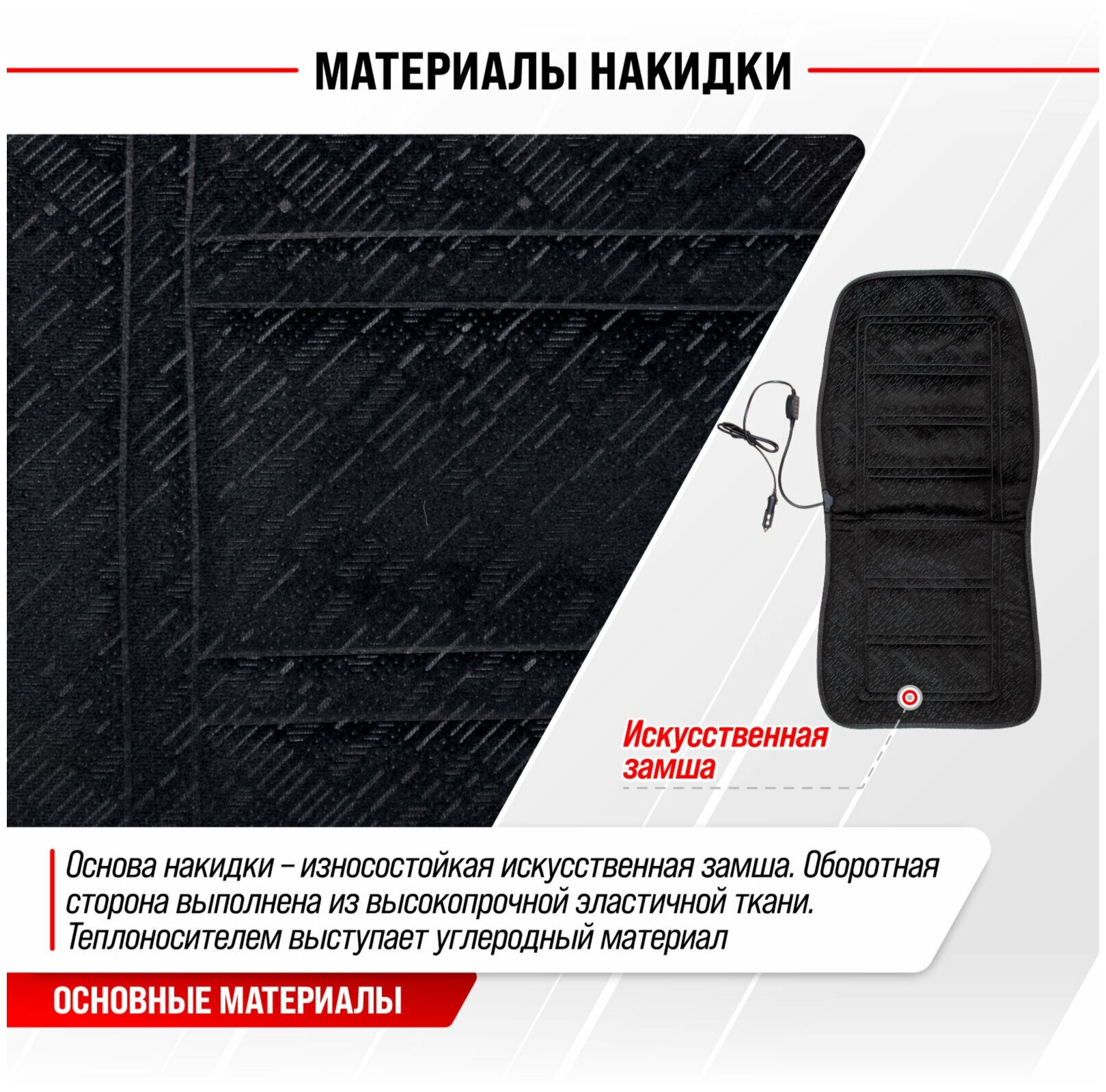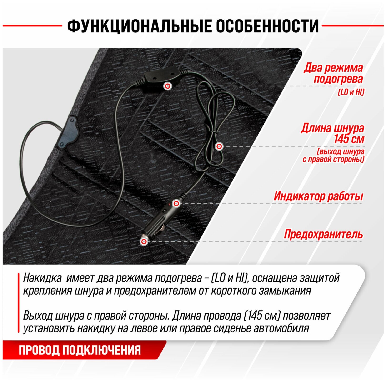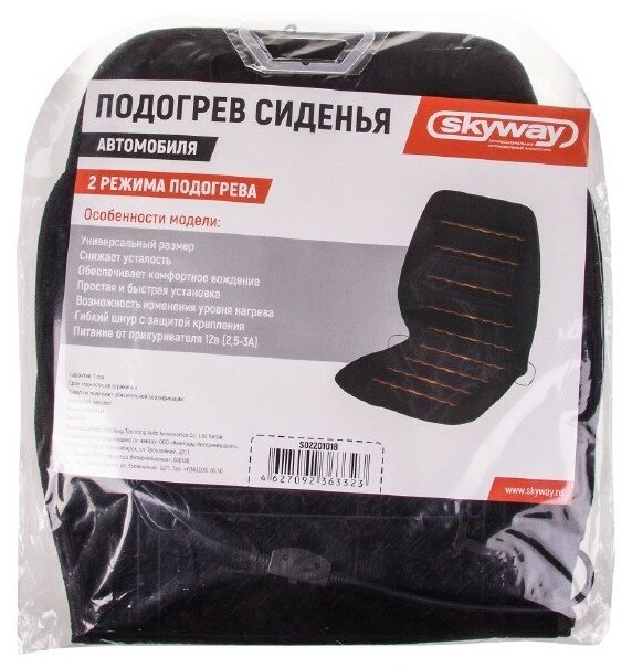 | Дополнительная информация | Рекомендации по уходу: Перед чисткой подогрева сиденья отключите устройство от бортовой сети питания. Не допускайте контакта изделия с водой. Не используйте растворителей, абразивные и агрессивные чистящие средства , щетки. Чистку подогрева сиденья осуществляйте сухой салфеткой. |