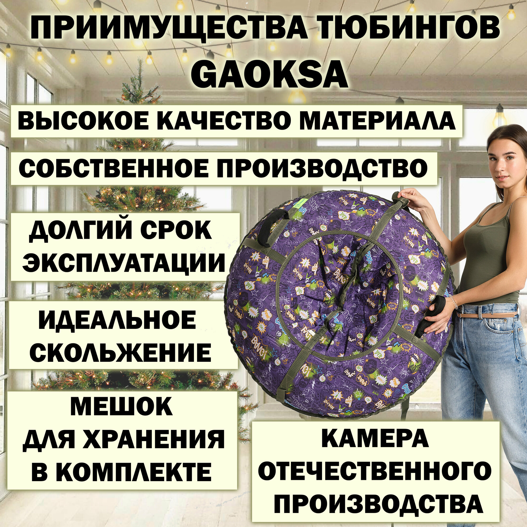 Ватрушка тюбинг 120см с ручками и буксировочным тросом GAOKSA / Гаокса, санки детские для снегоходов с чехлом, камерой и мешочком для хранения интересное: