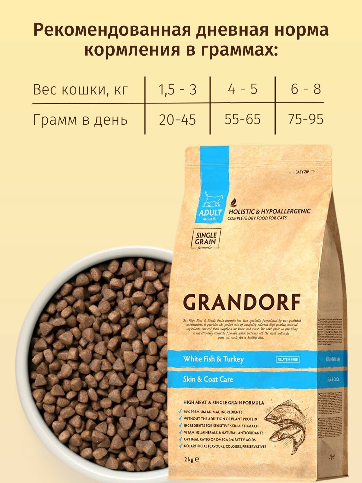 GRANDORF SINGLE GRAIN CAT ADULT SKIN & COAT CARE WHITE FISH & TURKEY для кошек с чувствительной кожей и шерстью с белой рыбой и индейкой (2 кг)