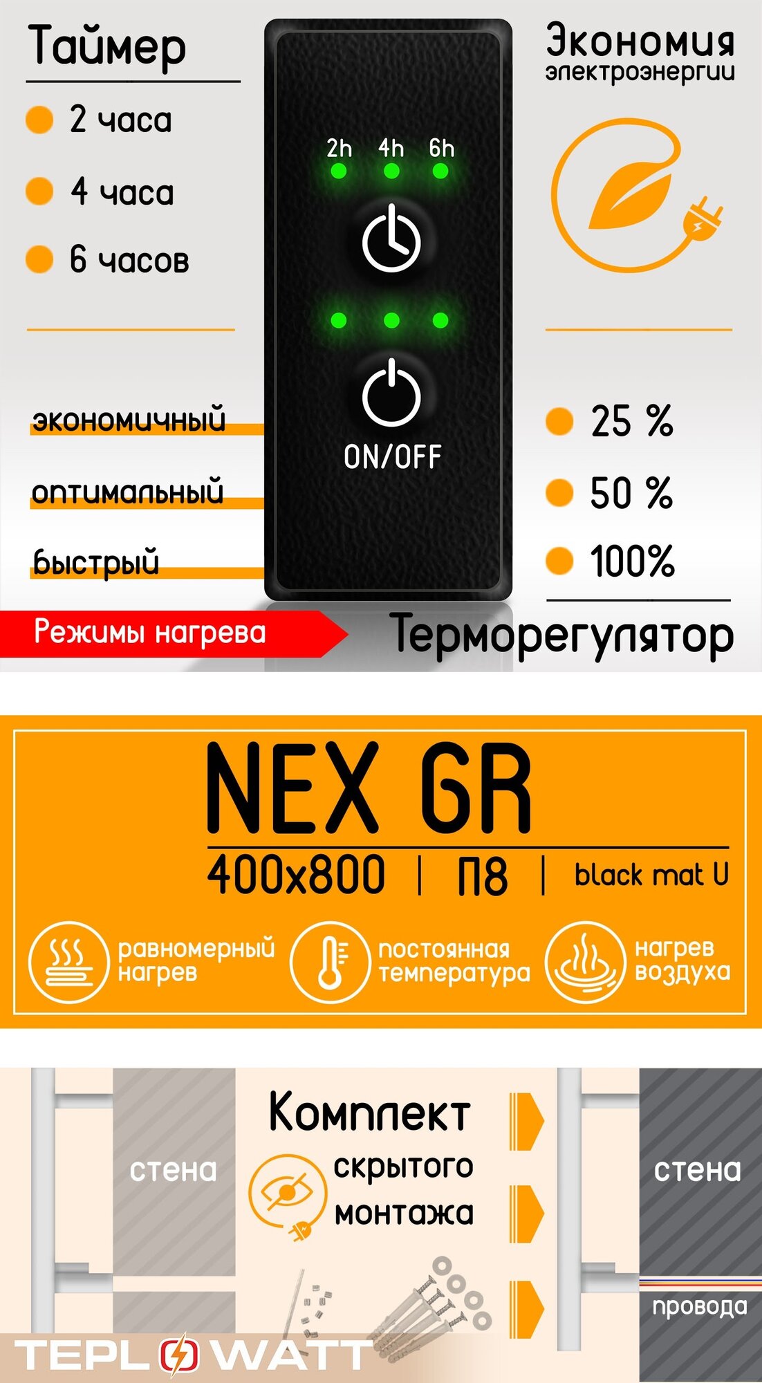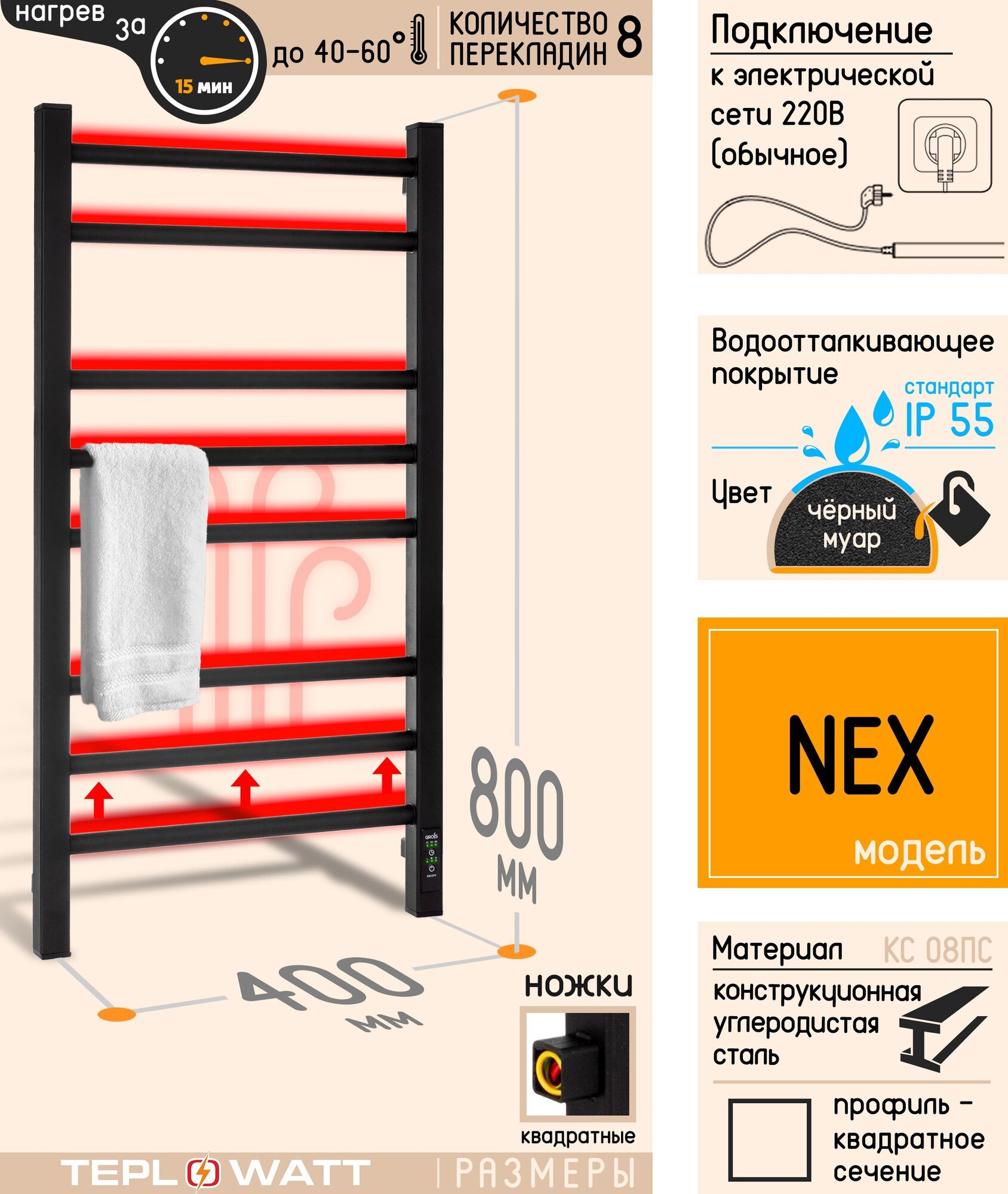 Полотенцесушитель электрический Nex GR-112 400х800 П8 black mat U универсальное подключение (левый/правый)