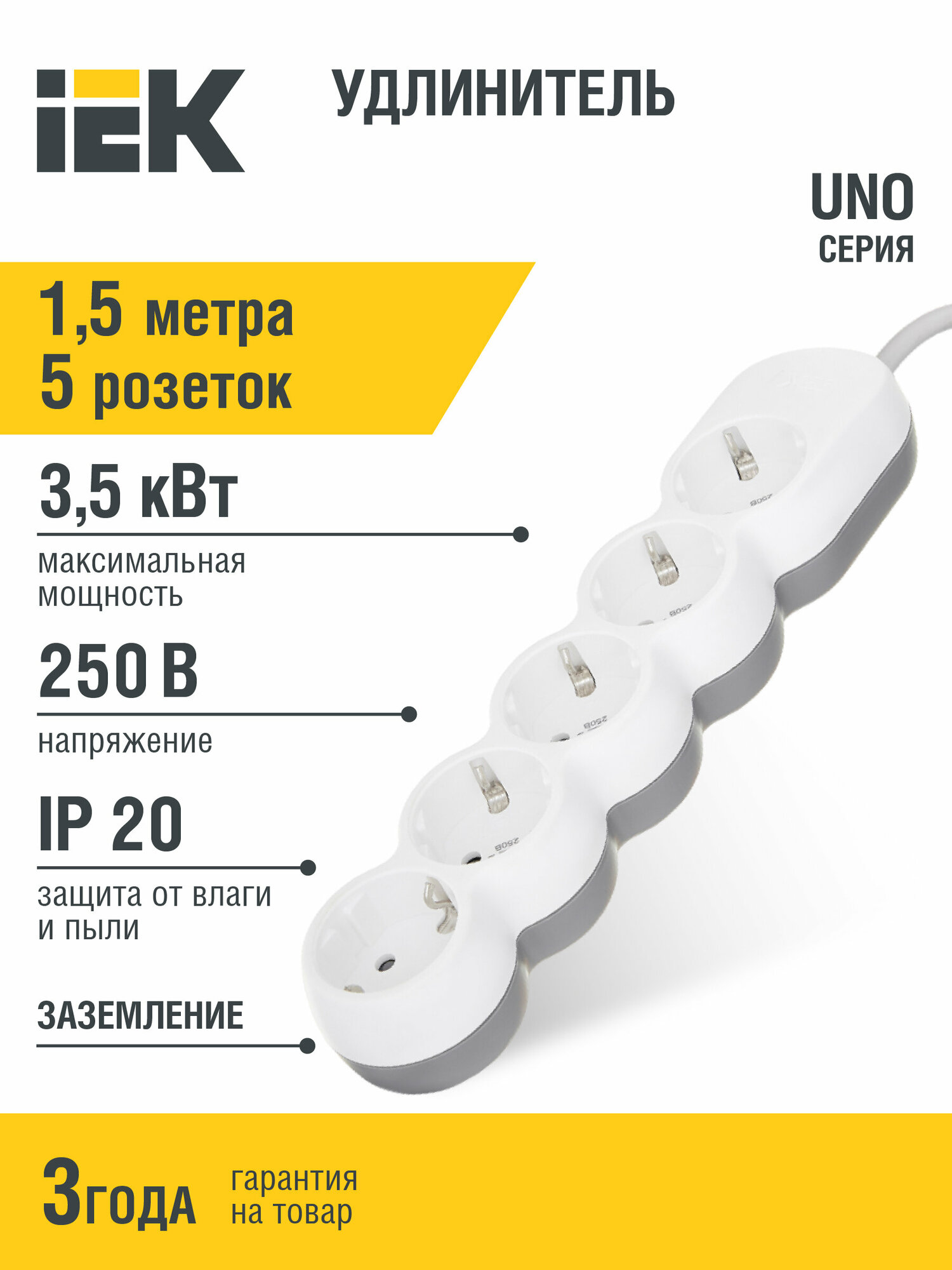 Удлинитель IEK Uno У05, ПВС 3 x 1,5 мм², с заземлением, 5 розеток, 1,5 м, белый интересное:
