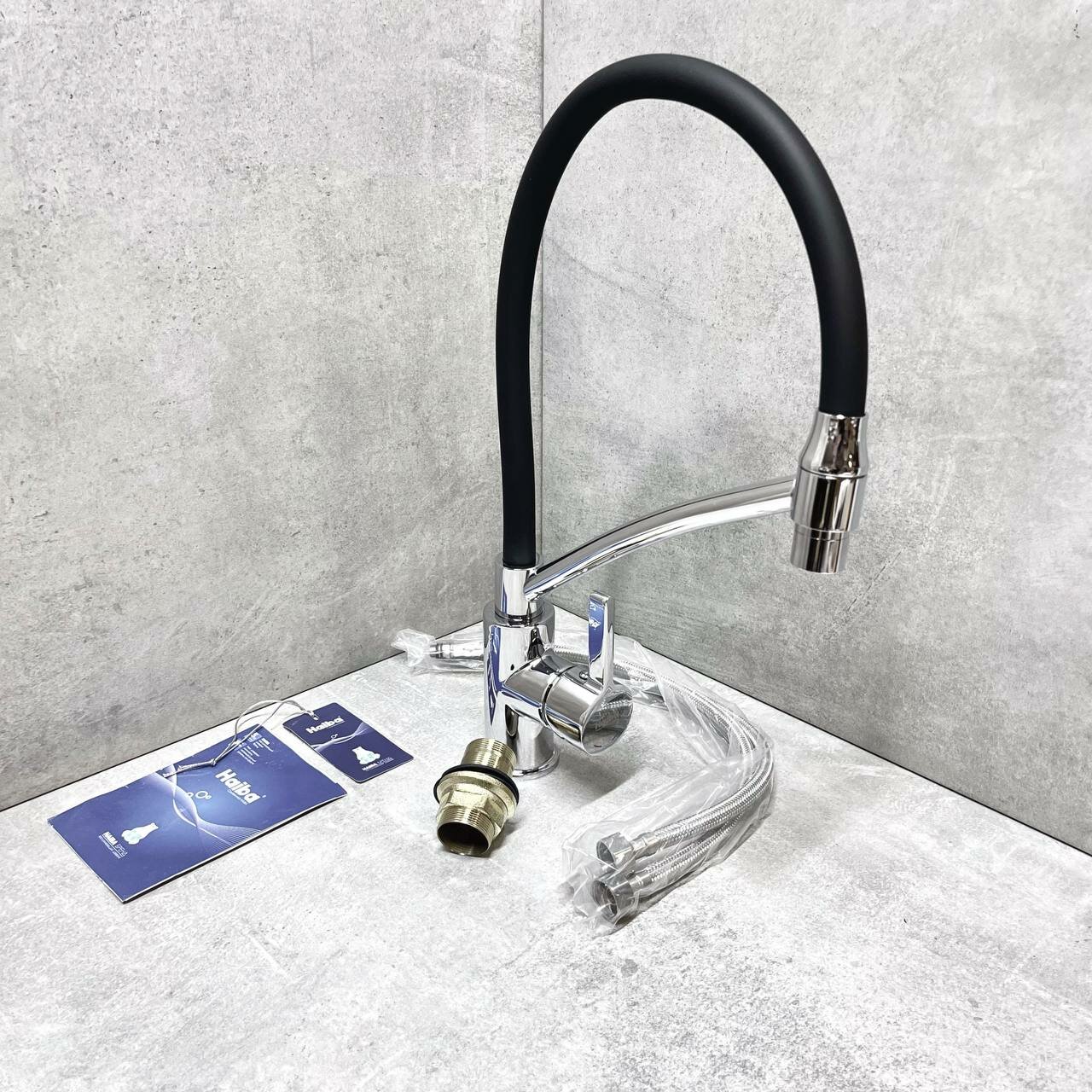 Смеситель для кухни Haiba с гибким силиконовым изливом черный/хром