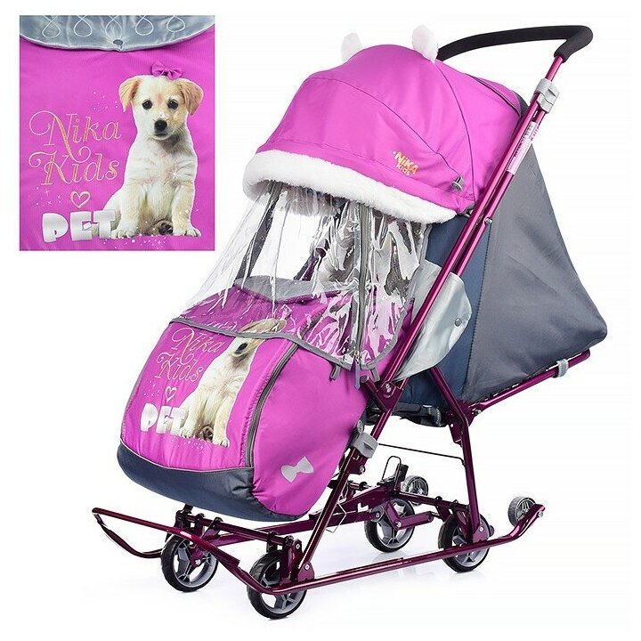Санки-коляска НД7-6/16 со щенком орхидея /Ника чехол д/ног, колесо, механизм качания