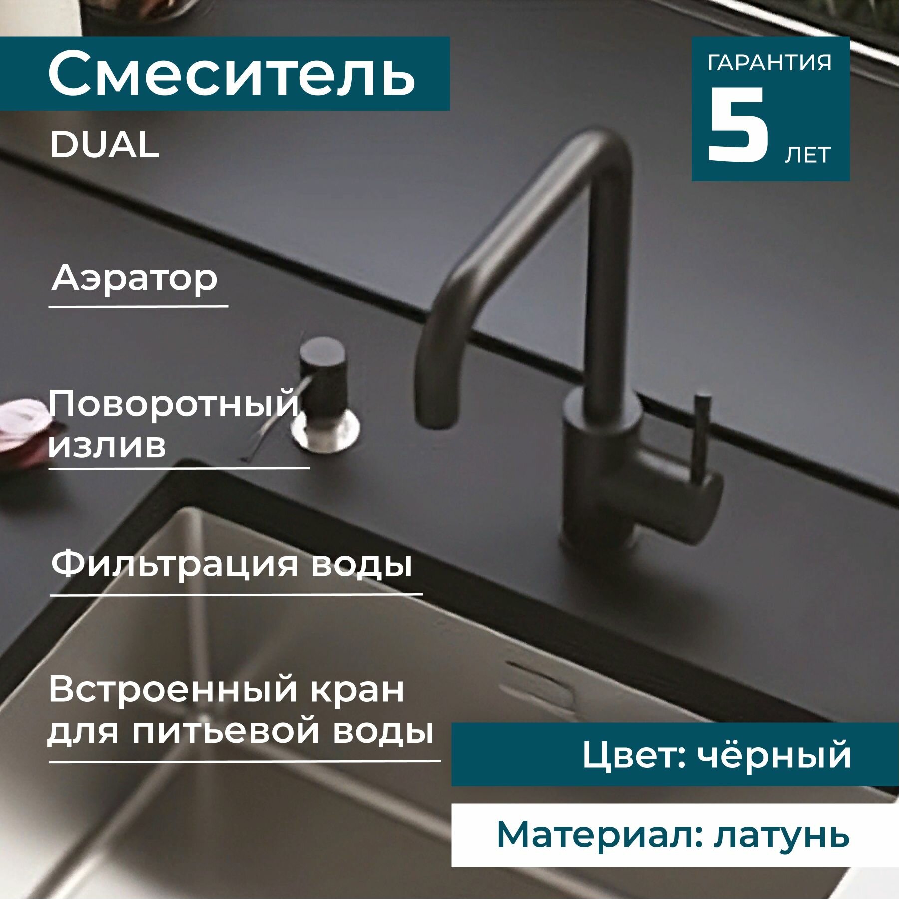 Смеситель для раковины с фильтром и краном для питьевой воды ALVEUS DUAL G91 CARBON поворотный для кухни и ванной. Латунь. Цвет черный