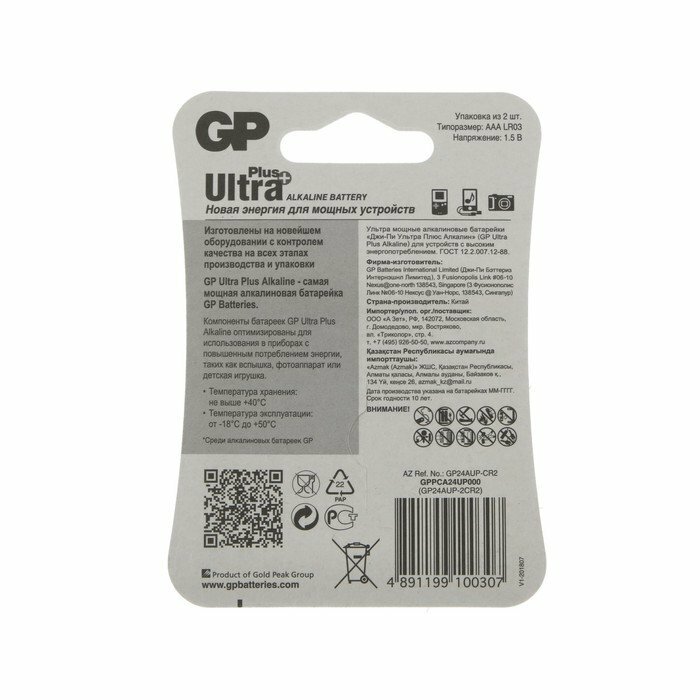 Батарейка алкалиновая GP Ultra Plus, AAA, LR03-2BL, 1.5В, блистер, 2 шт., 2 штуки