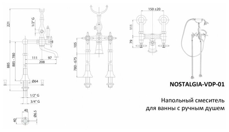 Напольный смеситель для ванны с ручным душем Cezares NOSTALGIA-VDP-01-M