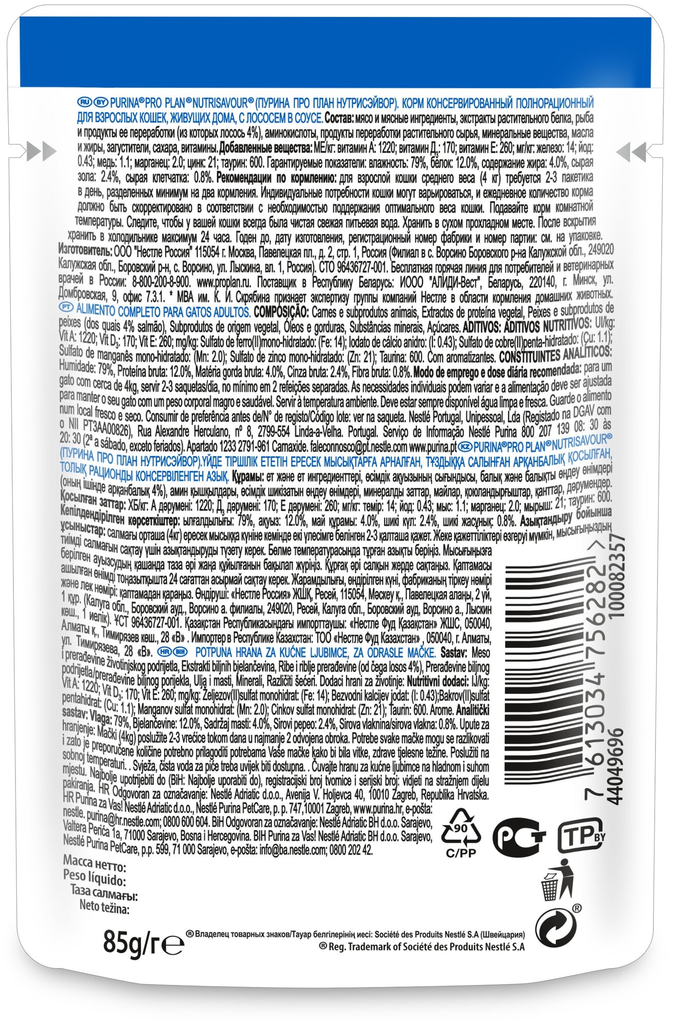 Влажный корм PRO PLAN для домашних кошек, лосось в соусе, пауч, 85 г