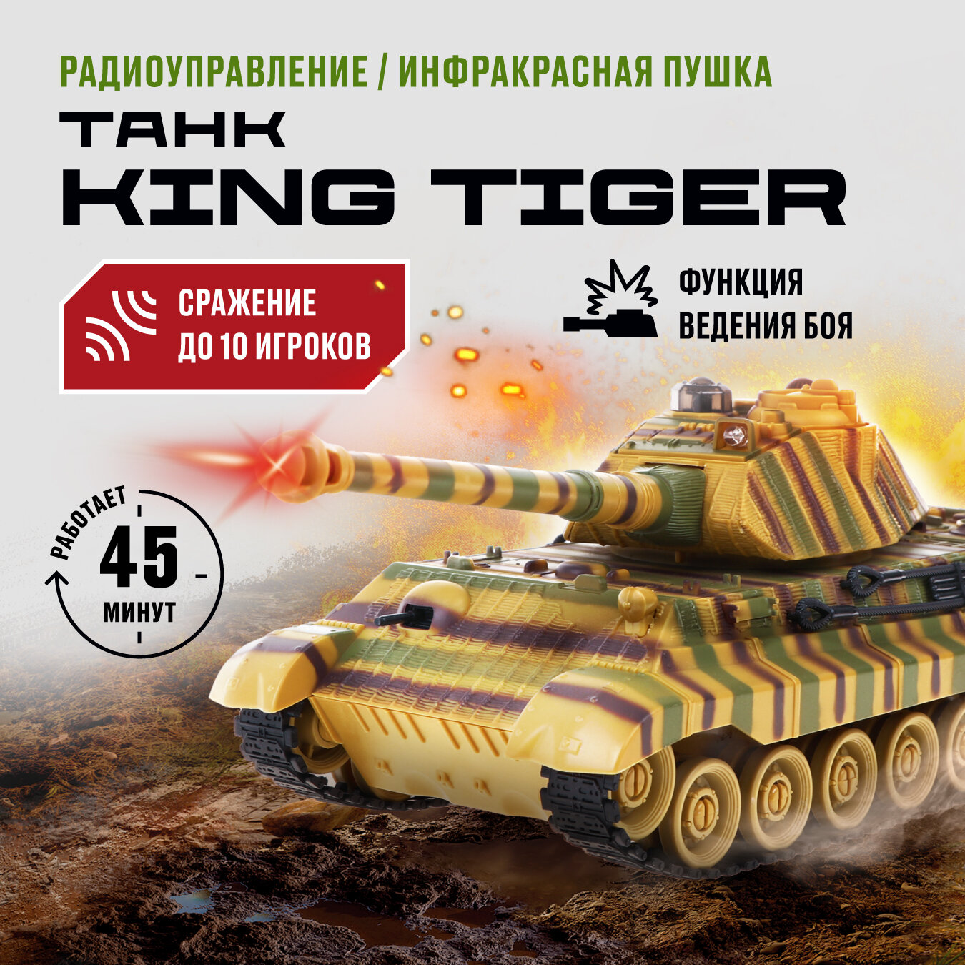 | Дополнительная информация | танк осуществляет движение вперёд и назад, поворачивает вправо и влево, преодолевает подъёмы под углом 45°, совершает круговое вращение на месте и поворот башни вправо-влево на 320°; в игрушке предусмотрены демонстрационный режим и автоотключение; танк оснащён функцией боя |