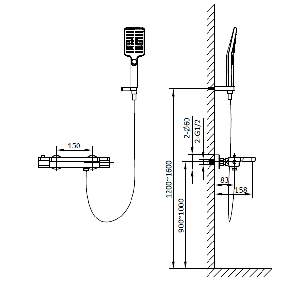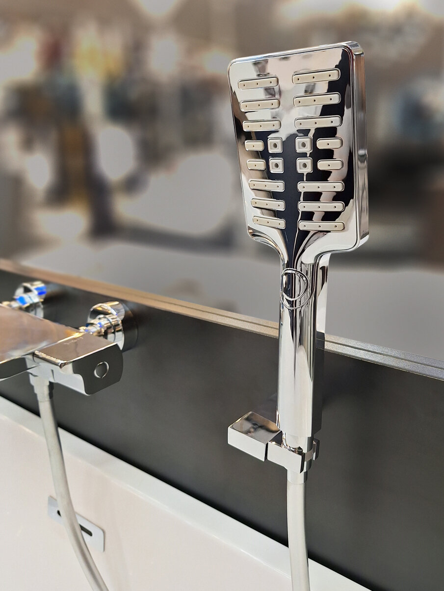 | Комплектация | термостатический смеситель настенного монтажа, ручной душ, гибкий полимерный шланг, эксцентрики, чаши декоративные |