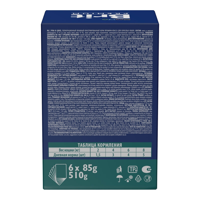 | Дополнительная информация | Паучи отлично дополнят полнорационный сухой корм Brit Premium и внесут разнообразие в питание Вашей кошки. |