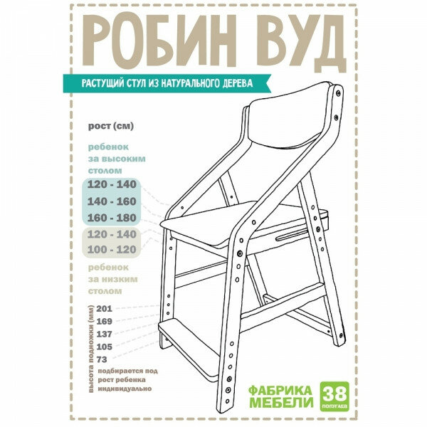 | Дополнительная информация | съемные чехол на спинку и подушка на сиденье; каркас стула из массива березы, спинка и сиденье из березовой фанеры; регулировка сиденья по высоте на 5 положений: 507; 475; 444; 413; 382 мм; регулировка подножки на 4 положения (от пола): 173; 141; 110; 79 мм; размер сиденья - 38 х 38 см; ширина подножки - 70 мм; подходит детям от 6 лет; подходит для стола высотой до 75 см; регулировка глубины сиденья |