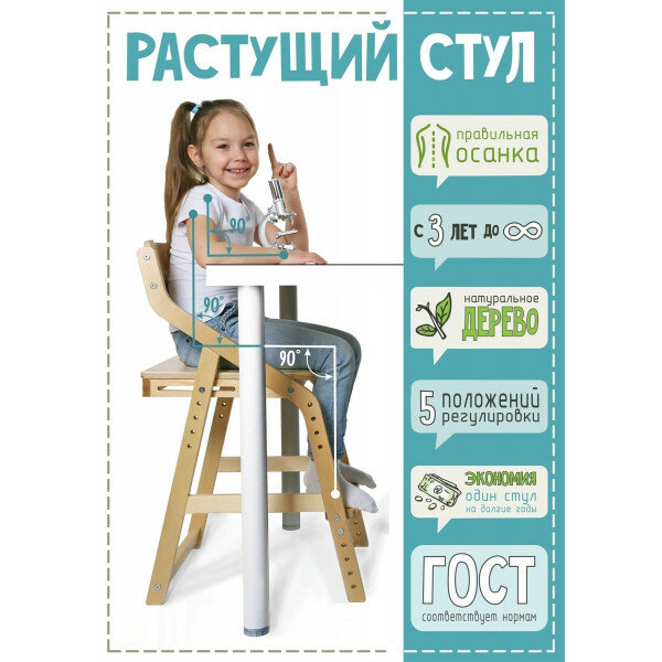 Стул детский регулируемый по высоте для школьника "Робин WOOD" натуральное дерево (ЛАК) с чехлом Лазурь